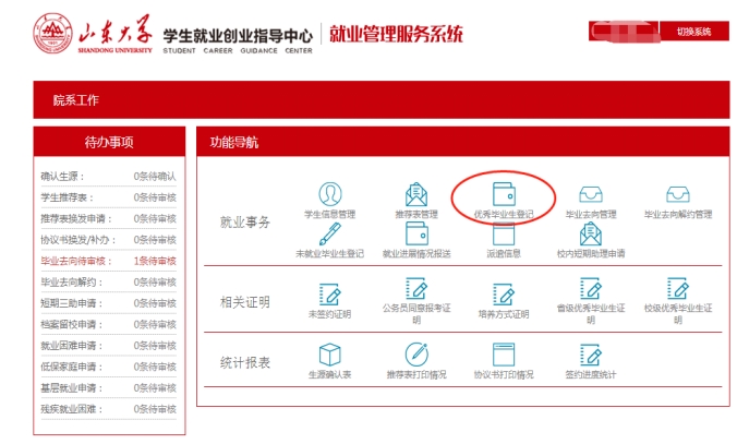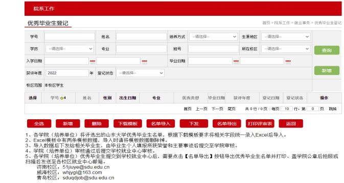 1.各学院(培养单位)登录“山东大学就业管理服务系统”后,进入“就业事务”-“优秀毕业生登记”,将初选名单根据系统模板要求导入。