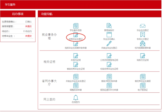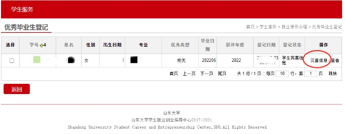 学生登录“山东大学就业管理服务系统”后,进入“就业事务”-“优秀毕业生登记”,查看并完善登记表相关信息,填写无误后提交至学院审核。