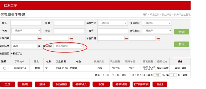 3.学生填写完毕提交后,学院(培养单位)可在“优秀毕业生登记”栏目查看待审核学生名单,审核通过后提交至就业中心等待学校审核。